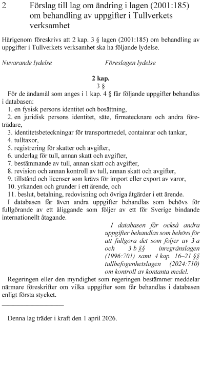 2. lag om ändring i lagen (2001:185) om behandling av uppgifter i Tullverkets verksamhet,