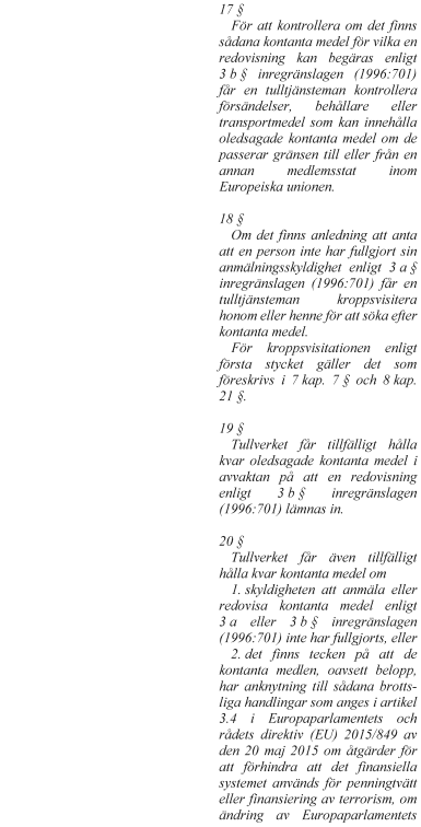 Riksdagen antar regeringens lagförslag om att bl.a. göra det möjligt för Tullverket att kontrollera införsel och utförsel av kontanta medel vid gränsen mot andra EU-länder samt att utvidga inregränslagens tillämpningsområde till att även omfatta bestämmelser om anmälnings- och redovisningsskyldighet vid införsel eller utförsel av kontanta medel över Sveriges gräns mot ett annat EU-land.