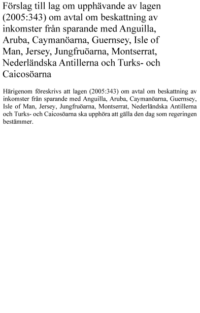 Regeringen föreslår även att lagen (2005:343) om avtal om beskattning av inkomster från sparande med Anguilla, Aruba, Caymanöarna, Guernsey, Isle of Man, Jersey, Jungfruöarna, Montserrat, Nederländska Antillerna och Turks- och Caicosöarna upphävs.
