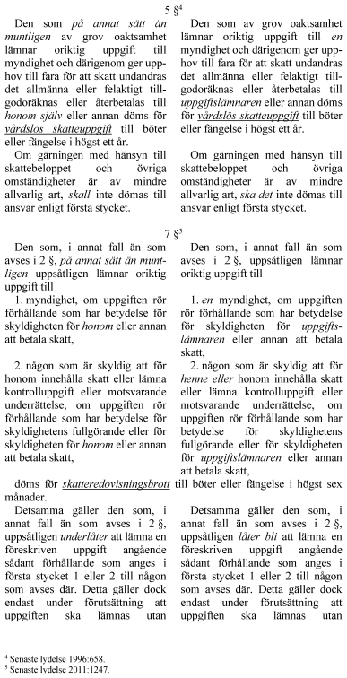 Regeringen föreslår att oriktiga uppgifter som lämnas muntligen ska kunna ligga till grund för skattebrott, vårdslös skatteuppgift och skatteredovisningsbrott. Oriktiga uppgifter som lämnats muntligen ska också kunna ligga till grund för skattetillägg. I skattebrottslagen ska även mindre ändringar av språklig natur göras för att modernisera äldre bestämmelser.
