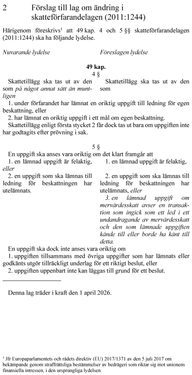 Utskottet ställer sig bakom regeringens förslag till ändringar i skattebrottslagen och skatteförfarandelagen. Ändringarna innebär att undantaget för muntliga uppgifter tas bort när det gäller skattebrott, vårdslös skatteuppgift och skatteredovisningsbrott. Det innebär att även muntliga uppgifter kan leda till straffansvar enligt skattebrottslagen. Regeringen föreslår att muntliga uppgifter ska kunna ligga till grund för skattetillägg och att definitionen av begreppet oriktig uppgift ändras – detta för att tydliggöra att den som lämnar en uppgift om mervärdesskatt som avser en transaktion som ingick som ett led i ett mervärdesskattebedrägeri ska anses ha lämnat en oriktig uppgift om den som lämnade uppgiften kände till eller borde ha känt till detta.