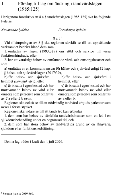 1. Riksdagen antar regeringens förslag till lag om ändring i tandvårdslagen (1985:125).