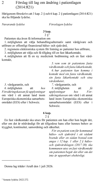 • Informationskravet i förhållande till patienter stärks. En patient ska få information om vem som är patientens fasta vårdkontakt och fasta läkarkontakt samt hur patienten kan komma i kontakt med sin fasta vårdkontakt, sin fasta läkarkontakt och sina vårdenheter.