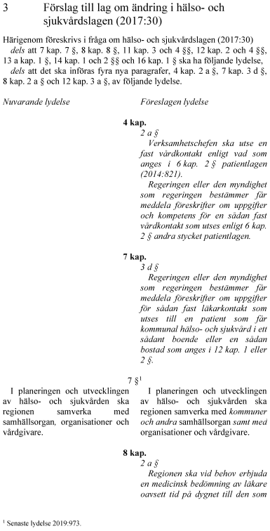 Det föreslås även att det ska införas krav på att kommunen ska utse en fast vårdkontakt, om patienten begär det eller om det inte är uppenbart obehövligt, till en patient som får vård i kommunal hälso- och sjukvård.