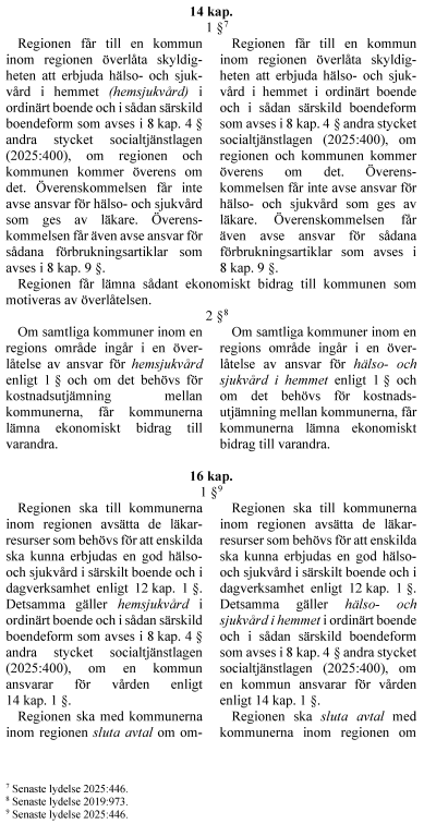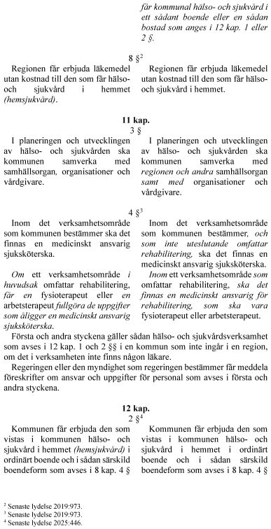 • Termen hemsjukvård tas bort och ersätts i tillämpliga fall med hälso- och sjukvård i hemmet.