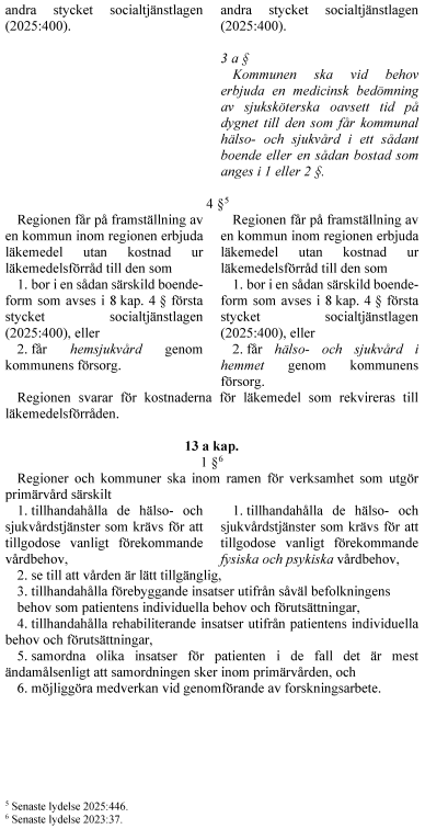 • Det förtydligas att en medicinsk bedömning av läkare och sjuksköterska vid behov ska erbjudas oavsett tid på dygnet i kommunal hälso- och sjukvård.