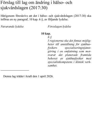 Regeringens lagförslag innebär att det i regionerna ska finnas möjligheter att anställa sjukhusfysiker som gör specialiseringstjänstgöring, i en omfattning som motsvarar det planerade framtida behovet av sjukhusfysiker med specialistkompetens.