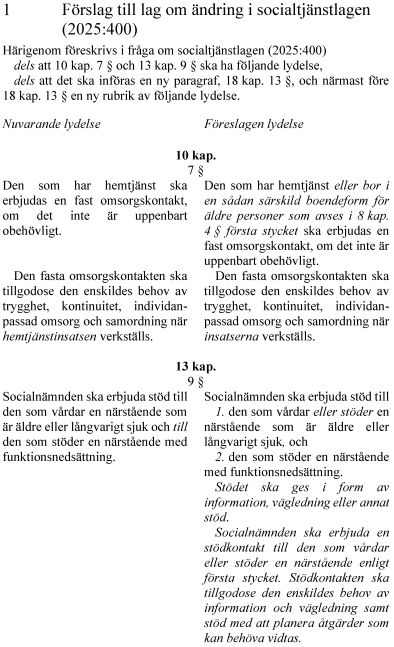 I propositionen föreslås ändringar i socialtjänstlagen (2025:400). Den som bor i särskilt boende för äldre ska erbjudas en fast omsorgskontakt, om det inte bedöms vara uppenbart att behov saknas. Stödet till den som vårdar eller stöder en närstående tydliggörs på så sätt att socialnämnden ska erbjuda information och vägledning. Socialnämnden ska vidare erbjuda en stödkontakt till den som vårdar eller stöder en närstående. Stödkontakten ska tillgodose den enskildes behov av information och vägledning samt stöd med att planera åtgärder som kan behöva vidtas.