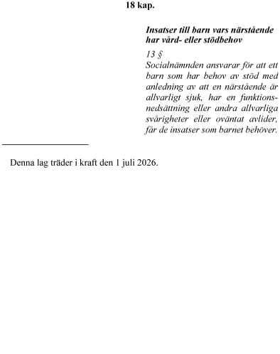 Socialnämndens ansvar för ett barn som har behov av stöd med anledning av att en närstående t.ex. är allvarligt sjuk eller oväntat avlider, tydliggörs.