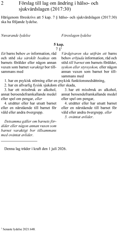 I hälso- och sjukvårdslagen (2017:30) och patientsäkerhetslagen (2010:659) tydliggörs vårdgivarens och hälso- och sjukvårdspersonalens ansvar för att stödja barn när barnets förälder, eller någon annan vuxen som barnet bor tillsammans med, t.ex. har en allvarlig fysisk sjukdom eller oväntat avlider. Ansvaret ska även omfatta situationen när ett barns syskon exempelvis är allvarligt sjukt.