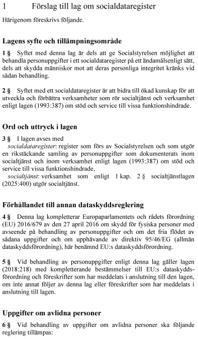 Regeringen föreslår att det ska införas en ny socialdataregisterlag som kompletterar EU:s dataskyddsförordning. Med EU:s dataskyddsförordning avses Europaparlamentets och rådets förordning (EU) 2016/679 av den 27 april 2016 om skydd för fysiska personer med avseende på behandling av personuppgifter och om det fria flödet av sådana uppgifter och om upphävande av direktiv 95/46/EG (allmän dataskyddsförordning). Syftet med lagen är dels att ge Socialstyrelsen möjlighet att behandla personuppgifter i ett socialdataregister på ett ändamålsenligt sätt, dels att skydda människor mot att deras personliga integritet kränks vid sådan behandling. Förslaget utökar Socialstyrelsens möjlighet att behandla personuppgifter i nationella socialdataregister. Ett socialdataregister ska bidra till en ökad kunskap för att utveckla och förbättra socialtjänsten och verksamheten enligt lagen (1993:387) om stöd och service till vissa funktionshindrade, förkortad LSS.