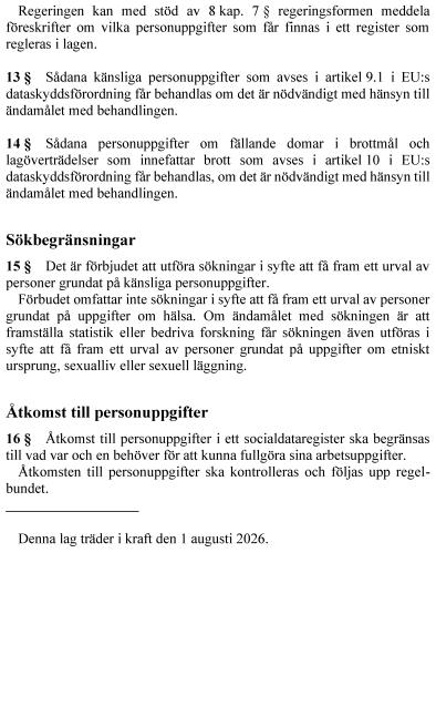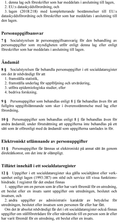 Riksdagen antar regeringens förslag till en lag om socialdataregister och förslagen till ändringar i socialtjänstlagen och lagen om stöd och service till vissa funktionshindrade. Den nya lagen och de ändrade bestämmelserna utökar Socialstyrelsens möjlighet att behandla personuppgifter och syftar till att bidra till en ökad kunskap för att utveckla och förbättra socialtjänsten och kommunernas verksamhet enligt lagen om stöd och service till vissa funktionshindrade.