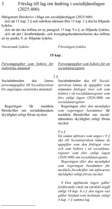 3. Riksdagen antar regeringens förslag till lag om ändring i socialtjänstlagen (2025:400).