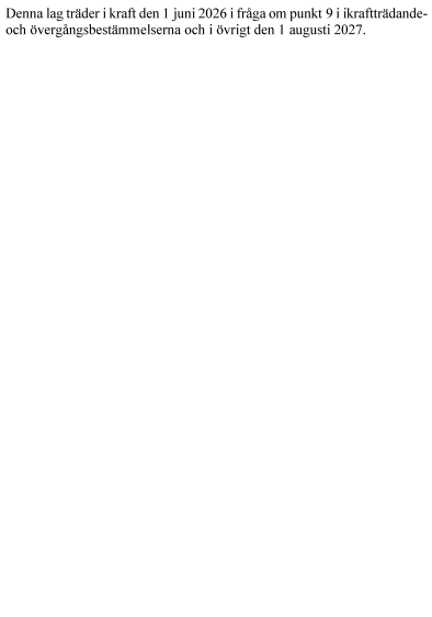 Den nya lagen föreslås träda i kraft den 1 augusti 2026. Bestämmelserna om uppgiftsskyldighet föreslås träda i kraft den 1 augusti 2027.