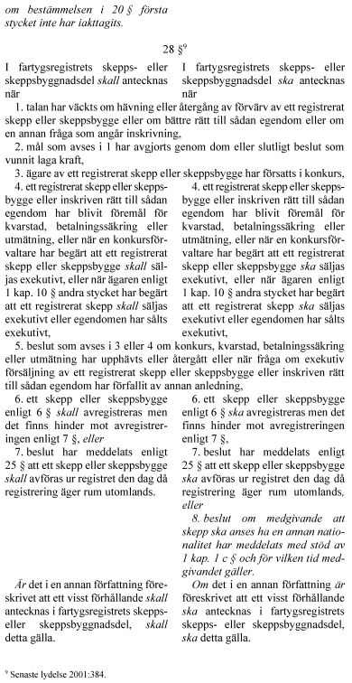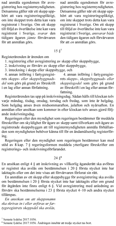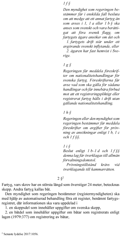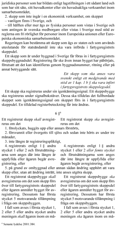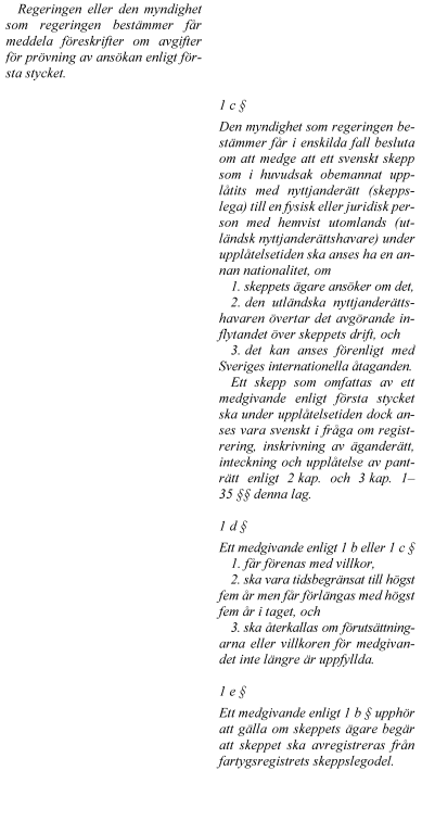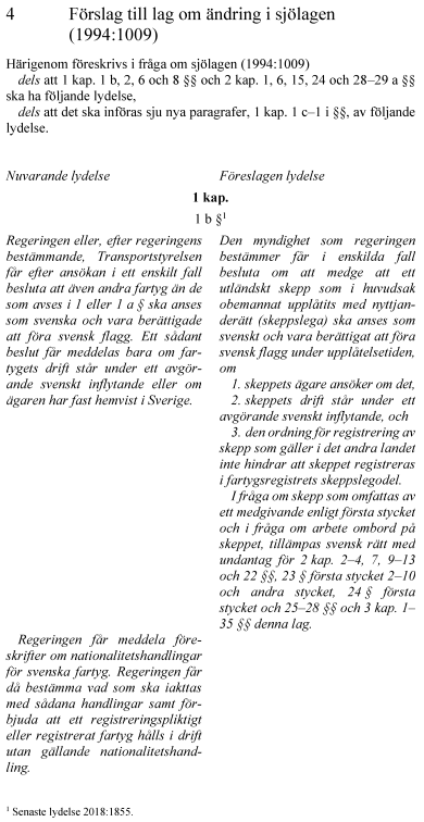 Regeringen föreslår att den myndighet som regeringen bestämmer, i detta fall Transportstyrelsen, ska få besluta om att medge att ett utländskt skepp som i huvudsak upplåtits obemannat med nyttjanderätt tillfälligt ska anses vara svenskt och vara berättigat att föra svensk flagg. För att det ska vara möjligt anser regeringen att det är nödvändigt att det svenska fartygsregistret utökas med en skeppslegodel.