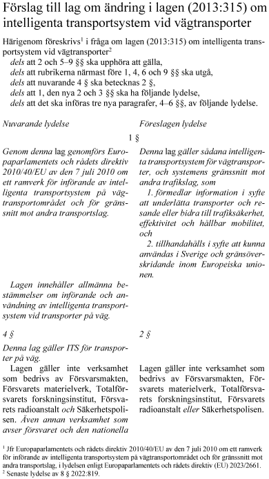 I propositionen föreslår regeringen ändringar i lagen (2013:315) om intelligenta transportsystem vid vägtransporter. Ändringarna är en del av genomförandet av EU:s direktiv (EU) 2023/2661 om intelligenta transportsystem på vägtransportområdet.