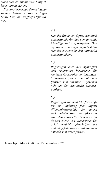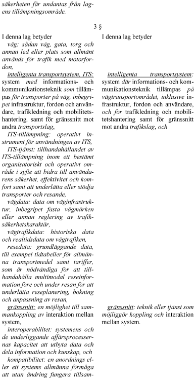 Enligt regeringens förslag ska det av lagen framgå att regeringen eller den myndighet som regeringen bestämmer ska få meddela föreskrifter om intelligenta transportsystem, data och tjänster som används i systemen. Regeringen föreslår samtidigt att uttrycken intelligenta transportsystem och gränssnitt ska förklaras i lagen, medan övriga ordförklaringar i den nuvarande lagen bör flyttas till föreskrifter på lägre nivå än lag, eller strykas ur regelverket om de inte längre används.