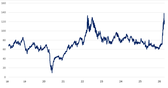 (Spotpris för Brentolja i Europa, FOB, USD per fat)