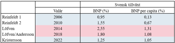 (Genomsnittlig årlig tillväxt per mandatperiod, reala termer)