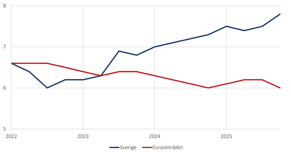 (Svensk arbetslöshet vs. arbetslöshet i euro-området, %)