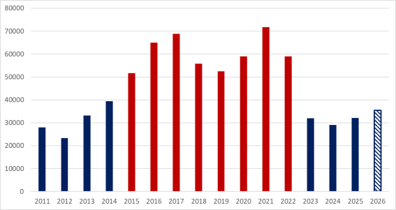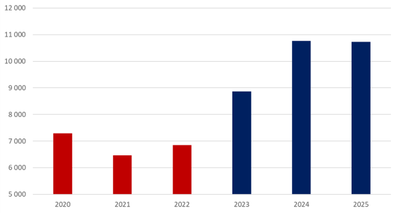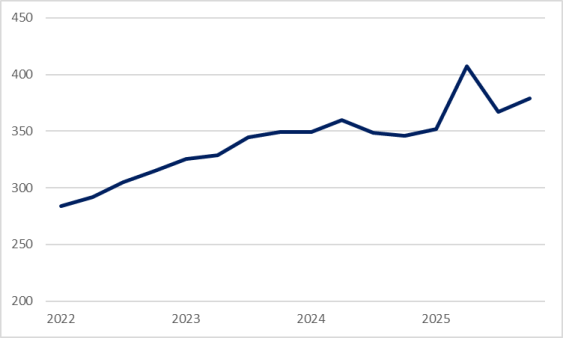 Efterfrågan på arbetskraft är fortfarande förhållandevis svag. Antalet nyanmälda lediga platser på Arbetsförmedlingen föll kraftigt under 2023 och 2024 och har därefter legat kvar på låga nivåer. Varslen har samtidigt varit fler än normalt sedan början av 2023. Sammantaget pekar detta på en arbetsmarknad där det skapas för få nya jobb.