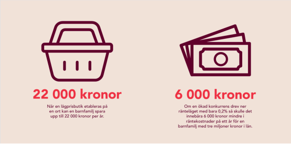 När en lågprisbutik etableras på en ort kan en barnfamilj spara upp till 22 000 kronor per år. Därför vill vi att det ska bli lättare att öppna nya butiker. Vi vill inleda arbetet med en nationell modell för fler matbutiker och för det arbetet avsätter vi 20 miljoner kronor till Boverket. Vi vill öka konkurrensen mellan grossisterna och vi vill att märkningen i butik ska bli tydligare.