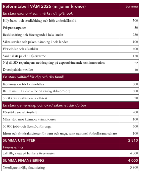 I vår höstbudget för 2026 presenterade vi socialdemokrater ett tydligt alternativ för att vända Sveriges negativa utveckling. I denna vårbudget bygger vi vidare på det arbetet med ytterligare reformer för att stärka Sverige och svenska familjer. Vi föreslår riktade åtgärder för att stärka svensk ekonomi och ge hårt arbetande människor mer pengar i plånboken, för att stärka välfärden och öka tryggheten och säkerheten i vårt land.