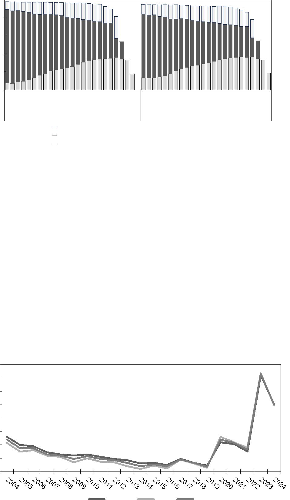 65 procent av övriga befolkningens ekonomiska standard. Av diagrammet framgår även att det är större skillnad mellan inrikes födda ensamstående kvinnor och män än mellan utrikes födda ensamstående kvinnor och män. Gruppen inrikes födda sammanboende pensionärer beräknas 2024 ha en ekonomisk standard som är högre än den ekonomiska standarden i den övriga befolkningen.