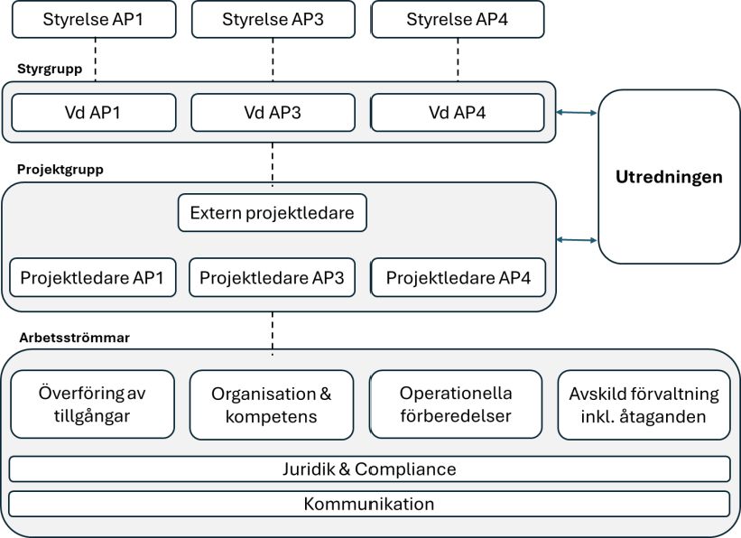 Utredningen har under arbetet med slutbetänkandet således fortsatt haft möten varannan vecka med projektgruppen som utgörs av de Mottagande fondernas externa projektledare och de respektive Fondernas projektledare (en eller två personer från ledningen från respektive fond, i huvudsak CFO). Utredningen har även fortsatt haft regelbundna möten med respektive fonds ordförande och vd. Utredningen har också besökt Fondernas styrelser. I oktober 2025 deltog Utredningen på ett ordinarie styrelsemöte för respektive fond, varvid Delbetänkandet och de frågor som omfattas av slutbetänkandet diskuterades. Utredningen har därmed fortsatt haft god tillgång till samtliga nivåer i Fondernas projektorganisation för avstämningar och faktainhämtning. Utredningen vill tacka de berörda fonderna för ett mycket gott samarbete.
