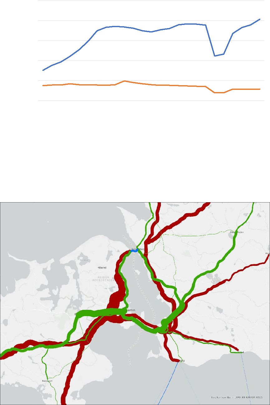 Utvecklingstrender och prognoser. Prognoser upprättas kring hur resande och transporter bedöms utvecklas fram mot olika tidshorisonter.
